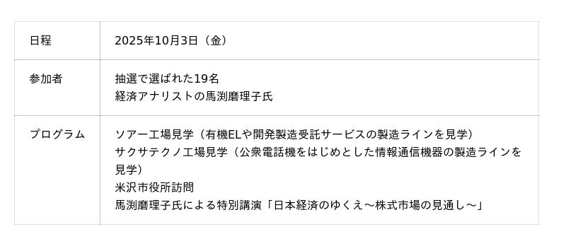 抽選で選ばれた19名の参加者と、一般社団法人 日本金融経済研究所 代表理事の馬渕磨理子氏をゲストとしてお迎えし、当社グループ企業のソアー、サクサテクノの工場見学、米沢市役所訪問を行いました。
