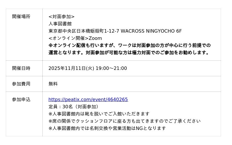 本イベントは、2025年9月に実施した「人事祭」で、「わかりやすかった」「もっと深く知りたい」とご好評をいただいたワークショップの拡大版です。