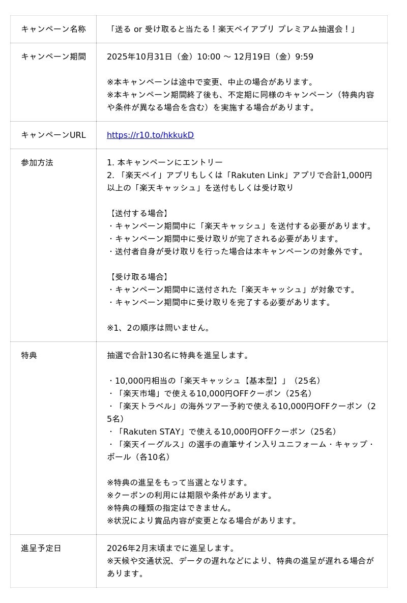 楽天ペイメント株式会社(以下「楽天ペイメント」)は、キャッシュレス決済サービス「楽天ペイ」アプリにおいて、「楽天キャッシュ」や「東北楽天ゴールデンイーグルス」(以下、「楽天イーグルス」)のグッズ、楽天グループのサービスで使えるクーポンが当たる「送る or 受け取ると当たる!楽天ペイアプリ プレミアム抽選会!」キャンペーンを、2025年10月31日(金)から12月19日(金)まで(注1)実施することをお知らせします。