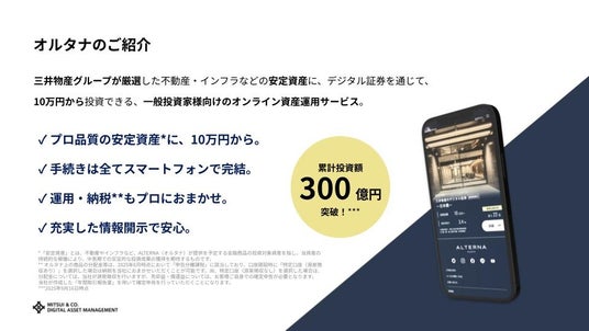 ※こちらに記載の内容は、受益証券発行信託スキームを用いた資産裏付型セキュリティトークンの取扱いについて、一般向けの公表のみを目的としたプレスリリースであり、日本国内外を問わず個別の金融商品等への募集・勧誘を目的とするものではありません。個別商品の募集・勧誘は、オルタナを通じて目論見書を使用して行います。※ 「安定資産」とは、不動産やインフラなど、オルタナが提供を予定する金融商品の投資対象資産を指し、当資産の持続的な稼働により、中長期での安定的な投資成果の獲得を期待するものです。なおオルタナが提供する金融商品は元本保証や将来の投資成果を保証するものではありません。