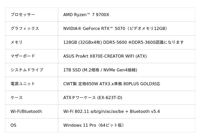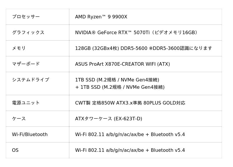 標準構成仕様(BTOによるカスタマイズ可能)