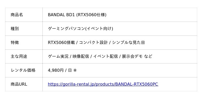 ゴリラレンタルに、RTX5060グラフィックボードを搭載したBANDAL製デスクトップパソコン「BD1」が入荷。1日あたり4,980円~でレンタル可能!