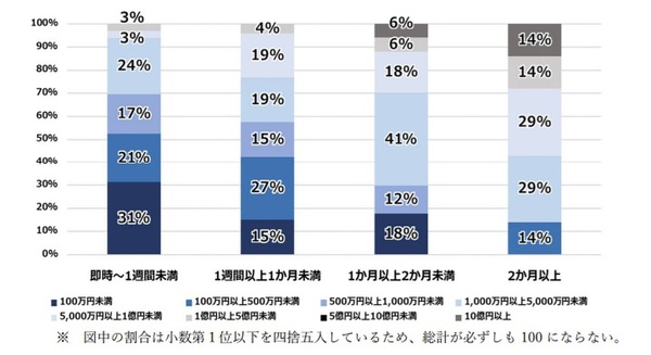 ランサムウェア攻撃の被害に遭遇すると、その後の復旧までの期間が長期化しやすい傾向にある。そして、その期間が長期化するほど、被害額は大きくなりがちであることが図1の調査データからもわかる。