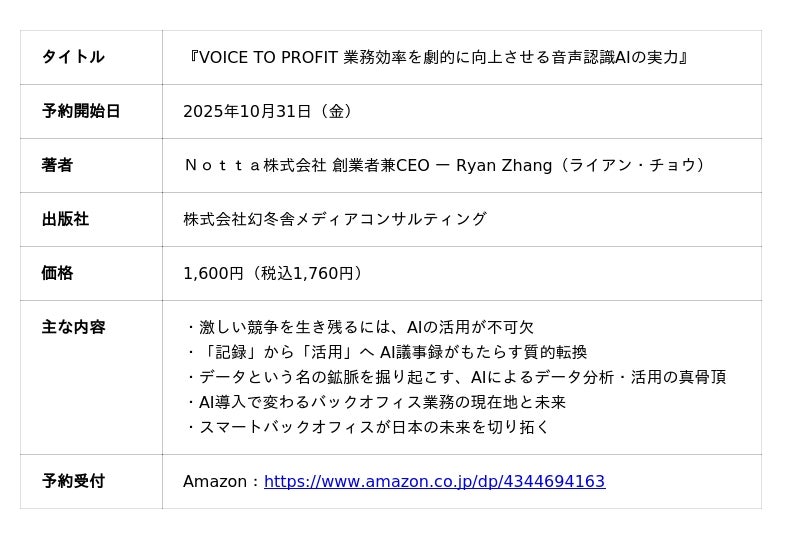 AI文字起こしサービス「Notta」を提供するNotta株式会社(本社:東京都千代田区、CEO:Ryan Zhang)は、創業者兼CEOであるRyan Zhang(ライアン・チョウ)の初の著書『VOICE TO PROFIT 業務効率を劇的に向上させる音声認識AIの実力』が、株式会社幻冬舎メディアコンサルティングより出版されることをお知らせします。2025年10月31日(金)よりAmazonにて予約受付を開始する予定です。