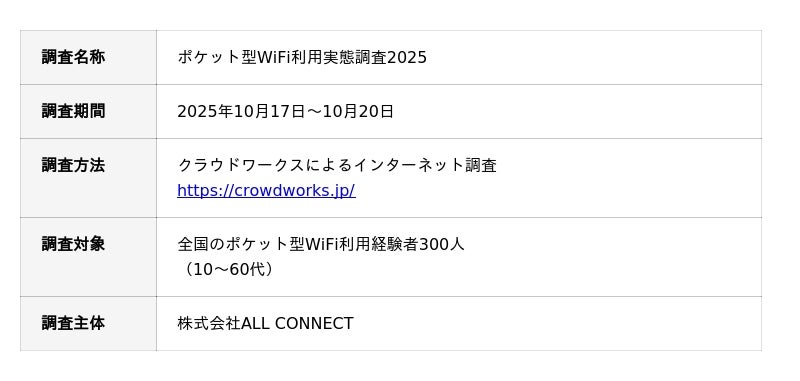 通信インフラ事業と地域振興事業を手掛ける株式会社ALL CONNECT(代表取締役社長:岩井宏太・本社:福井県福井市)が運営する通信メディア「オールコネクトマガジン(https://all-connect.co.jp/magazine/)」は、全国のポケット型WiFi利用経験者を対象にした「ポケット型WiFi利用実態調査2025」を実施しました(有効回答数:300名)。