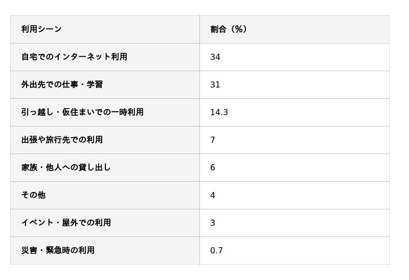 一方、外出時には「仕事用」「旅行時」「イベント参加時」など、持ち運べるネット環境としての利便性が評価されています。