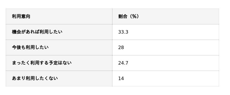 今後の利用意向については、「今後も利用したい」28%、「機会があれば利用したい」33%と、全体の約6割が継続的な利用に前向きな回答を示しました。
