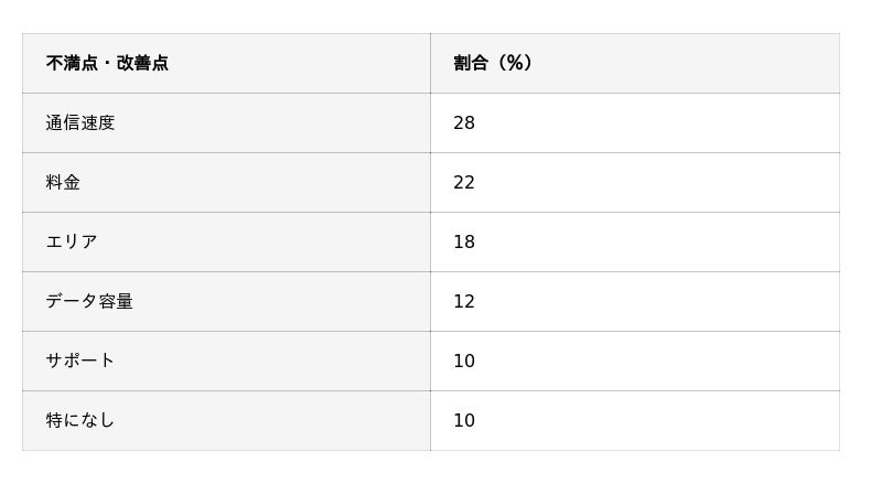 また、「容量制限が厳しい」「速度制限が早い」といった意見もあり、通信品質の安定化とデータ利用環境の改善が、今後のサービス満足度向上に向けた重要なポイントといえます。