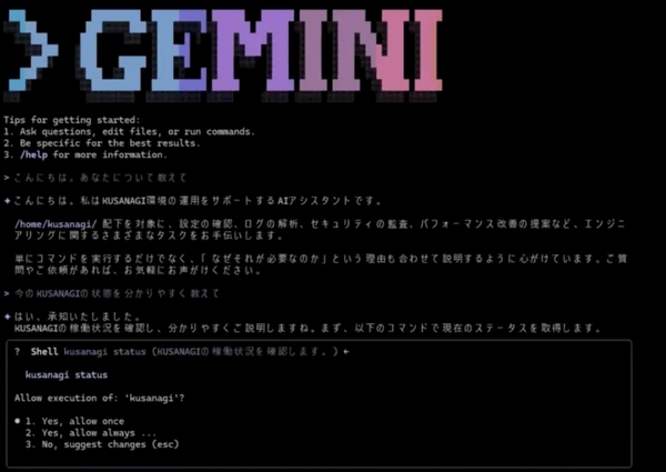 KUSANAGI AI アシストは、Googleが提供する「Gemini CLI」を基盤に、KUSANAGIの設定構造や運用ノウハウを理解し、誤操作や重要ファイルの改変が起こらないよう安全性を最優先に設計されている。