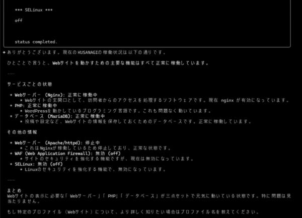 これにより、ユーザーの経験や理解度に応じて柔軟に受け答えをする“頼れる先輩エンジニア”として、対話を通じてKUSANAGIのサーバー運用を支援する。例えば、サーバー知識に不安があるユーザーには「手順を丁寧にナビゲート」し、経験豊富なエンジニアには、「コマンドや最適化方法を提示」するといった形で、それぞれに合ったサポートが提供される。