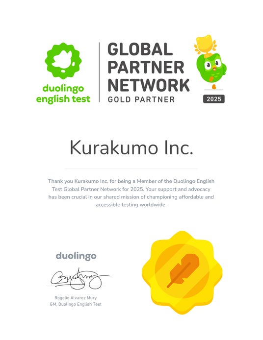 安価で高品質な語学学習サービスの提供をめざすクラクモ株式会社(所在地:東京都中央区、代表取締役社長:岡島 幹)は、このたびDuolingo English Test(以下DET)のGlobal Counselor Networkのゴールドパートナーレベルに認定されたお知らせいたします。以前はパートナーレベルとして活動しておりましたが、今回の認定により、日本初(2025/10/31時点 自社調べ)のGCNゴールドパートナー企業としてDET公式にも認められる信頼性の高いサービス(DET Bridge - https://det-bridge.com/)を提供していることが証明されました。