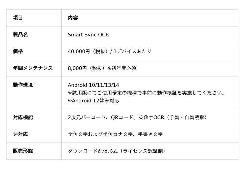 本製品は、Android端末で撮影したバーコード・QRコード・文字情報を即時に認識し、Bluetooth接続されたPCや業務アプリケーションの入力欄へリアルタイムにテキスト転送するモバイルOCRアプリです。