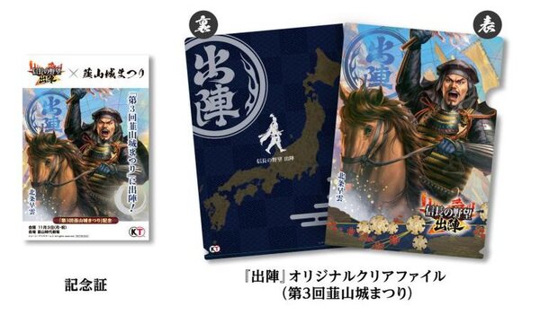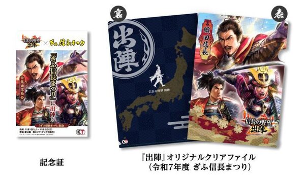 ご当地イベントの参加特典として、パネルミッション完全達成で記念証と『出陣』オリジナルクリアファイル(ぎふ信長まつり)をプレゼント予定。記念証の裏面にはシリアルコードが記載されており、案内にしたがってシリアルコードを入力すると登用札5枚を獲得できる。
