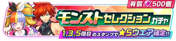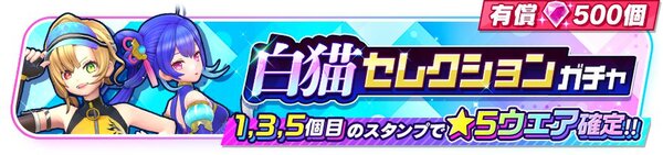 それぞれ★5ウェアが『モンスターストライク』(以下、モンスト)の2キャラクターのみ、『白猫プロジェクト NEW WORLD'S』(以下、白猫)の2キャラクターのみが登場するガチャの第2弾が開催予定。本ガチャは有償ジュエル500個限定で5回までまわすことができ、1回目、3回目、5回目のスタンプでは★5ウェアが確定となる。