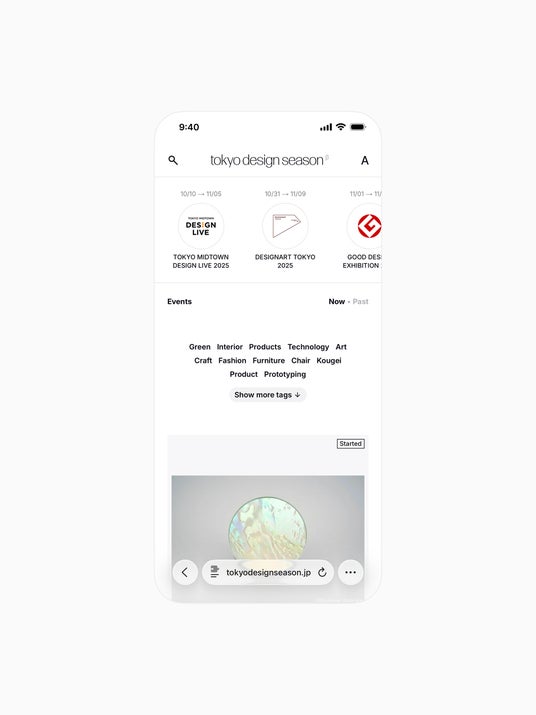オンラインプラットフォーム『tokyo design season』は、都内を中心に開催されるデザイン関連のイベント等を垣根なく集約した、ノンバイアスなデータベースです。「タグシステム」を中心とした検索機能を採用することで、オープンな情報設計に。AIアルゴリズムに偏らないことで、ユーザーが自らの関心を広げる手助けをします。