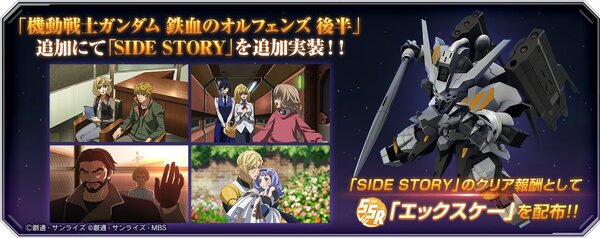 また、あわせて「機動戦士ガンダム 鉄血のオルフェンズ」に登場したキャラクターにまつわる物語を描いた「SIDE STORY」も実装。「SIDE STORY」をクリアすることでSSR「エックスケー」がクリア報酬として獲得できる。ぜひメインステージとあわせて楽しもう。