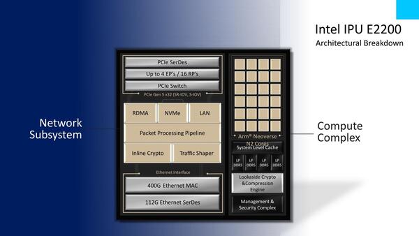 ここからはもう少し細分化していこう。まずは、記事冒頭の画像で左側に位置するNetwork Subsystemについてだ。Network Subsystemの最上位はPCI Expressで、その下にRDMA/NVMe/LANを処理する専用ブロックが置かれているのはE2100と同じ(もっとも個々のユニットの処理能力は倍増しているだろう)。