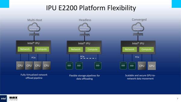 Multi-Hostは、それこそクラウドサービスのCPUインスタンスに相当するもので、HeadlessはSAN(Storage Area Network)のようなネットワーク・ストレージの構成を可能にする。Convergedが一番スタンダードな使い方だが、要するにコンバージド・ネットワークをIPUを使って簡単に構築できるわけだ。