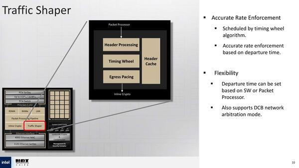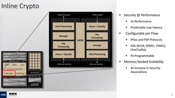 Crypto Engineもまた、400GbpsのLine Speedに対応できるように、従来比2倍の処理性能になっている。暗号化に関してはFlow(ある特定の相手との通信ストリーム)ごとに暗号化方式と暗号化キーが異なるので、Flow単位で管理しているのは当然であるが、どのくらいのFlow数を扱えるのかは不明である。