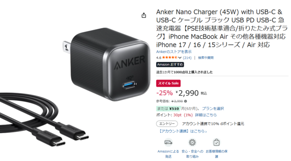 AmazonのスマイルSALEで登場!Anker Nano Charger(45W)with USB-C&USB-C ケーブル