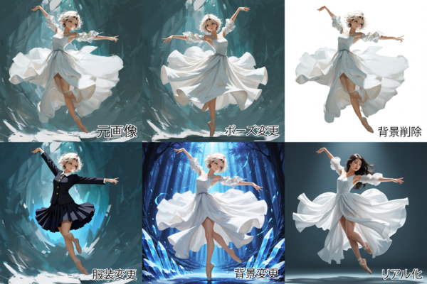 Qwen-Image-Edit-2509は基本性能が高いため、参照画像にプロンプトで指定するだけで、様々な変更をすることができます。次の画像は変更をしてみた例です。元の画像から、ポーズ変更、背景削除、リアル化などの操作が簡単にできます。さらに、2枚目として服装や背景を指定することで、それらだけを変更することもできます。かなり柔軟性の高いモデルであることがわかります。日本語のプロンプトも通ります。