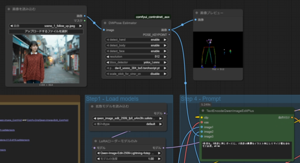 Openposeの追加ノードの接続方法。公式テンプレートに「DWPose Estimator」を追加して、「画像を読み込む」を追加して、「TextEncodeQwenImageEditPlus」のImage3に入力するだけ。プロンプトに「3枚目と同じポーズに」と指定するだけで機能する。画像プレビューには生成したOpenposeの画像が出力される