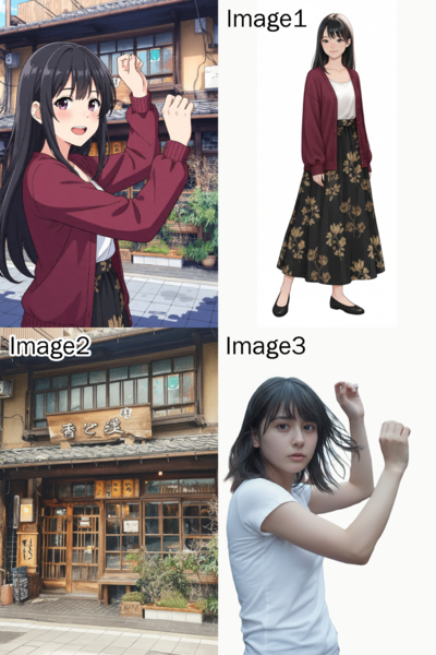 Openposeの組み合わせを実際に試してみたものが、次の画像です。Image1を入力画像として、背景をImage2、ポーズをImage3として入力して出力しました。キャラクターが参照画像と同じポーズをとり、服装も維持されたまま出力されています。デフォルト設定ではImage1の画像の比率で出力されるため、位置はImage1のサイズで調整する必要があります。