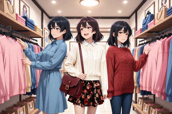 この連載の作例モデル「明日来子さん」に“秋服コーデ”をした状態。服とバッグはMidjourneyで作成。プロンプトは「1枚目の人物に、2枚目の服装を、3枚目のカバンを肩に持たせて、ジーンズなし、笑顔」