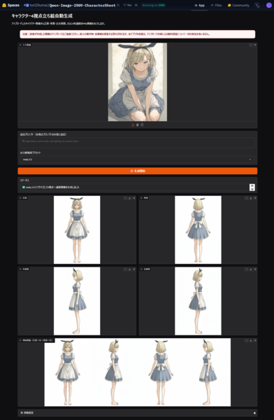 性能の高さをわかりやすく理解できるのが、キャラクターの四面図を自動作成できるアプリ「Qwen-Image-2509-CharacterSheet」です。エンジニアのとりにくさんがHuggingFaceの「Space」機能で無料公開しています。アプリでは、全身像の画像1枚から、ほぼ完璧な四面図を作ることができます。アニメ風でも、実写風でも、そのどちらでも問題なく描写できます。