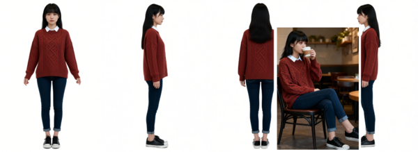 参照画像を3枚まで組み込むと以下のようなことができます。1枚目の人物(左)に、2枚目の服装(右上)、小物のバッグ(右下)を参照させることで、服装を着ている状態の画像を手軽に作ることができるのです。人物の顔や体形、髪形など、すべての一貫性を維持したまま、完成画像を作り出すことができています。こうしたアパレル画像への応用は、一貫性の実現で期待されるものの重要なものの1つでした。