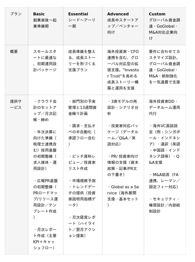 企業規模・成長段階・ニーズに応じて4つのプランをご用意しています。Global as a Serviceは、Advancedプラン以上で適用されます。また、Customプランは要件に応じて設計します。
