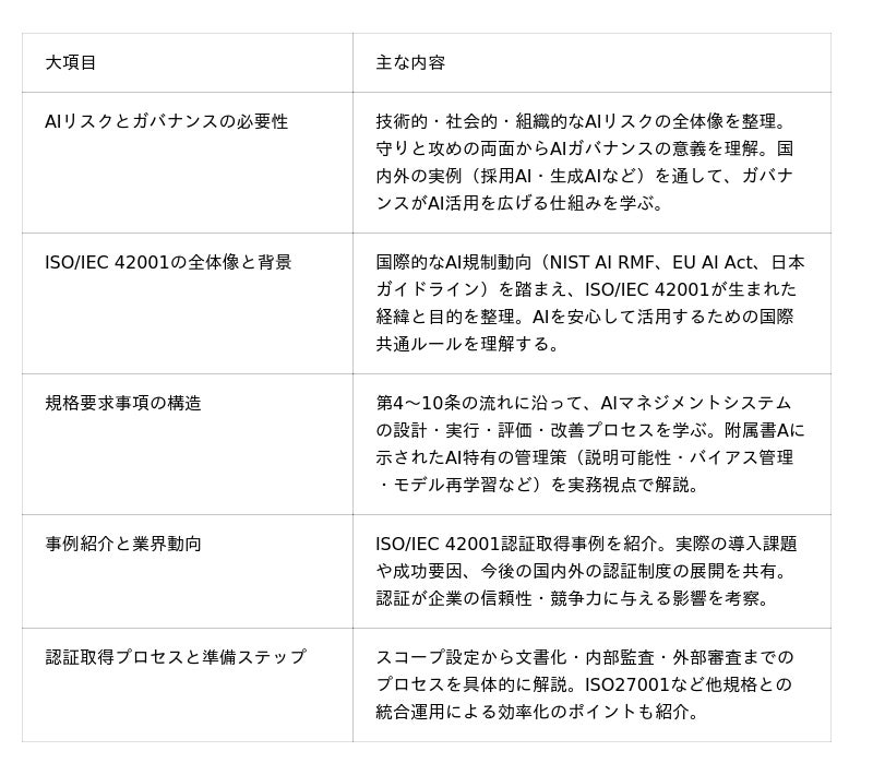 本講座は、AIガバナンスとリスクマネジメントを統合的に理解し、組織としてのAI活用を安全かつ効果的に推進するための実践型プログラムです。AIの透明性、公平性、説明責任といった社会的要請に応えるため、国際標準「ISO/IEC 42001」を基盤に、AIマネジメントシステムの構築と運用を体系的に学ぶことができます。