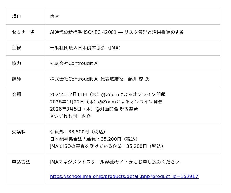 株式会社Controudit AI(代表取締役:藤井 涼)は、一般社団法人日本能率協会(JMA)が開講する新講座「AI時代の新標準 ISO/IEC 42001 ― リスク管理と活用推進の両輪」に協力し、カリキュラム設計および講師として参画いたします。
