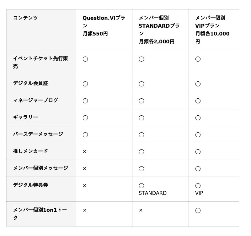 ※箱推しプランでお楽しみいただけるコンテンツはメンバー個別プランの特典にも全て含まれています。メンバー個別プランに加入される場合は、Question.VIプランに登録されないようご注意ください。