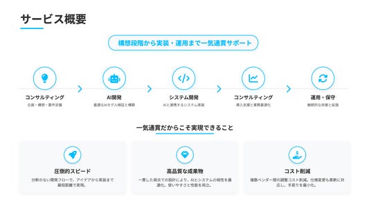 この新サービスは、AI受託開発・業務システム開発・AI/ITコンサルティングを一気通貫で提供するもので、最新のAI研究知見と実装力を融合し、企業のAI導入をスピーディかつ実践的に実現します。