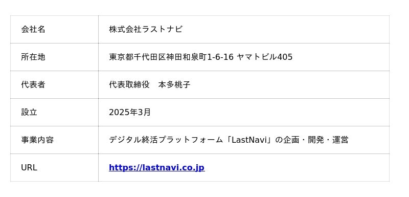 株式会社ラストナビは、「デジタル世代の終活のスタンダードを創る」をビジョンに掲げ、2025年3月に設立された終活DXスタートアップです。