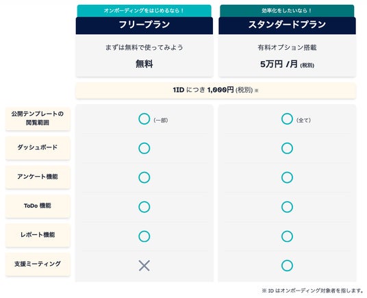 フリーミアムモデルとなっているので、基本機能は無料で操作可能です。新入社員1名をオンボーディングプログラムに乗せる際に、1IDあたり1,100円(税込)となり、スタンダードプランでは毎月55,000円(税込)にて、分析機能や利用制限の解除がされます。