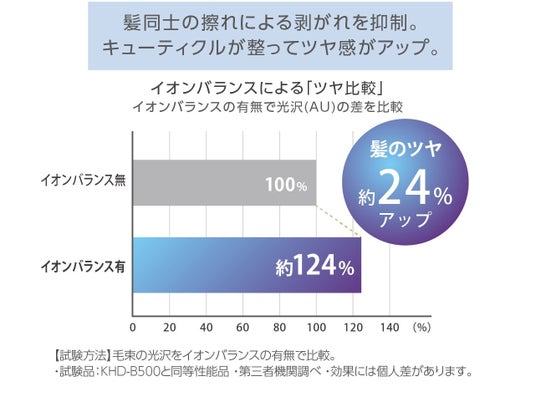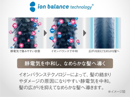 ・イオンバランステクノロジー搭載。プラスとマイナスのイオンが発生。髪全体の静電気を中和し、髪の広がりを抑えてまとまりよく、なめらかな髪へ導く。
