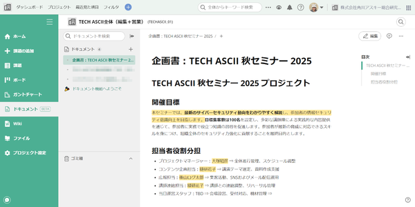 展示会の概要など共有すべき情報は「Wiki」に記載しました。後からプロジェクトに入ったメンバーからも「情報がまとまっていてわかりやすかった」との声がありました。関連するドキュメントやファイルなどもすべてBacklog上で共有することで、効率的に情報の集約ができたと思います。
