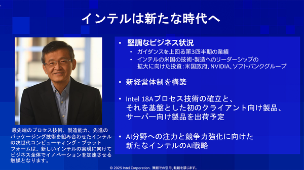 いろいろあって新CEOに就任したLip-Bu Tan(リップ・ブー・タン)さん。前CEOのPat Gelsinger(パッド・ゲルシンガー)さんの忘れ形見である最新プロセス「Intel 18A」の製品化を引き継ぎ、AI分野へ注力していくとのこと