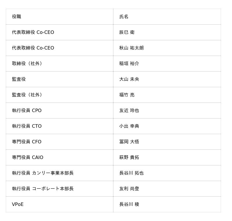 共同代表者:代表取締役 Co-CEO 辰巳 衛 / 秋山 祐太朗