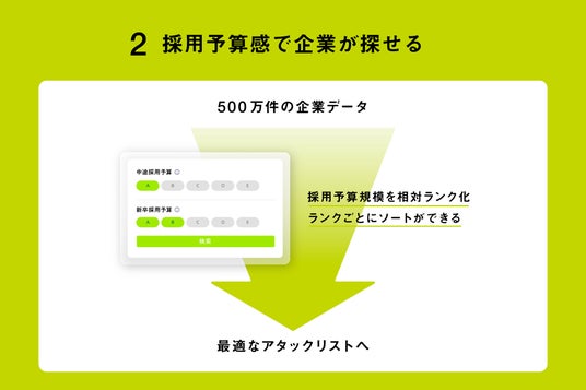 11月4日より、営業データベース「SaleSeed DB」の販売を開始いたします。 「SaleSeed DB」は、商材の意思決定に関わる担当者と直接つながることができる営業データベースです。 営業活動を商談数の向上や受注に結びつけるうえで、最も重要な要素のひとつが「アプローチリスト」です。直近の採用ニーズ(求人の有無や求人予算)、プレスリリースなどの企業動向をもとにリストの絞り込みが可能になります。 当社が4年間にわたる営業支援事業で培った知見を活かし、営業現場の痒いところに手が届く、成果を出せるデータベースを開発いたしました。