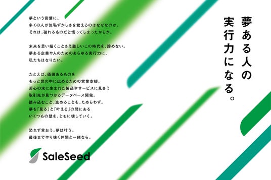 世の中には、夢があっても挑めない人がいます。環境に阻まれ、実力よりも状況で未来が決まってしまうからです。一方で、夢を持ちながらも前に進めない企業もあります。人手不足や採用難が、その成長を止めてしまうからです。私たちは、その人材と企業のど真ん中に立って、両者が本来の力を出し、その先で日本の生産力を上げていけるよう、邁進していきます。「夢ある人の実行力になる。」それが、私たちSaleSeedの使命です。人とテクノロジーの力で、夢を「見る」と「叶える」の間にあるいくつもの壁を、ともに壊していきます。