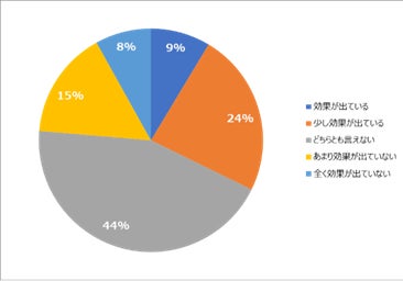 「現在の人財育成施策の効果について教えてください」という質問に対し、『効果が出ていると感じる』9%、『効果が少し出ていると感じる』24%、『どちらとも言えない』44%、『効果があまり出ていないと感じる』15%、『効果が出ていないと感じる』8%という結果になりました。 どちらとも言えない・効果があまり出ていないと感じる・効果が出ていないという回答を合算すると67%の組織で効果を感じられていないという結果となりました。人財育成施策について見直す必要が出てきている課題が明らかになりました。