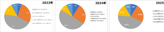 2023年の調査では、67%の組織が効果を感じられていないという実態が明らかになりました。2024年においてもその数字は65%とほとんど変化が見られず、2025年には再び67%となり、改善の兆しは見られませんでした。3年間の調査を通じて、「効果を感じられないまま続けている」ことが大きな課題として浮き彫りになりました。効果が感じられないのであれば、PDCAを回すなどして改善を図るべきですが、実態として効果を感じられないまま施策を続けてしまっている可能性があります。これは、人材育成の効果について「問題不感症」になってしまっていることが懸念されます。