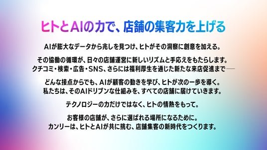 店舗産業は地域経済と雇用を支える社会基盤であり、カンリーはAIを単なる効率化のための技術ではなく、店舗産業の持続性を高めるための社会実装の手段として位置づけています。