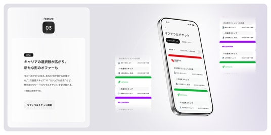 スカウトに加え、あなたに興味がある企業から、“書類選考スキップ” や “カジュアル会食” など、特別なオファー「リファラルチケット」を受け取れる。