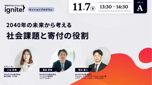 少子高齢化や人口減少が進む2040年、行政やビジネスの限界が迫る中、社会課題をどう解くか。本セッションは、未来の社会構造の変化と、アセットオーナーや市民による資金提供の最新動向の両面から、寄付の新たな役割を議論。未来から逆算し、社会変容を生み出すために必要な「資金が流れる仕組み」と「選ばれる組織」の姿を探ります。