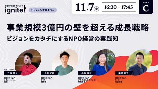 「年間収益3億円」という事業規模は、NPOにとって新たな事業展開や社会課題解決を加速させる重要なマイルストーンです。では、そのステージにたどり着くために、経営者は具体的に何を考え、実行してきたのでしょうか?このセッションでは、創業から3億円を突破した認定NPOの経営者を迎え、成長の軌跡を解き明かします。