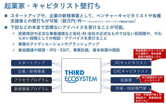 Third Ecosystemは、スタートアップや、スタートアップエコシステム(VC・CVC・支援機関等)の企業・人・リソース等をマッチングし連携を加速するグローバルプラットフォームです。「スタートアップ(1st)やVC・CVC・企業・支援機関(2nd)のエコシステムを補完・拡張する“第3の”スタートアップエコシステムとして、世界中の国や業界・技術を超えたスタートアップや、スタートアップエコシステム企業の連携や事業拡大を支援」しています 。